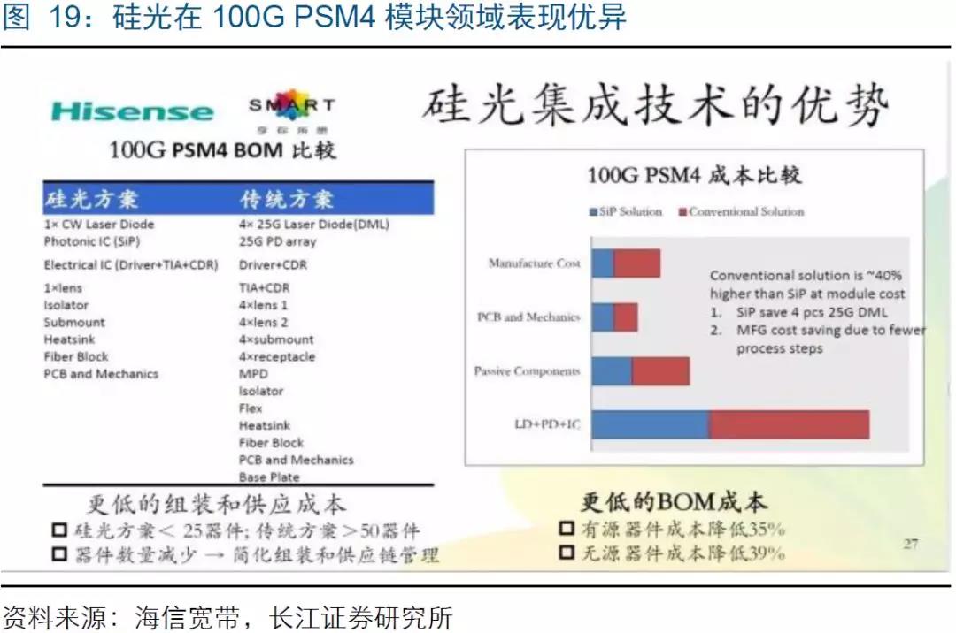 1、100G PSM4 硅光方案大獲全勝:硅光混合集成方案在應(yīng)用于 500m 數(shù)據(jù)中心互聯(lián)的 100G QSFP28 PSM4 光模塊產(chǎn)品戰(zhàn)勝傳統(tǒng)分立器件方案,目前已占據(jù)近 80%的市場(chǎng)份額。主要龍頭供應(yīng)商為 Intel 和 Luxtera,包括 Amazon、Facebook 和 Microsoft在內(nèi)的云服務(wù)廠商大份額采用硅光 PSM4 方案,主要原因在于硅光集成在短距離傳輸中保證性能的同時(shí),顯現(xiàn)出較大的成本優(yōu)勢(shì)。