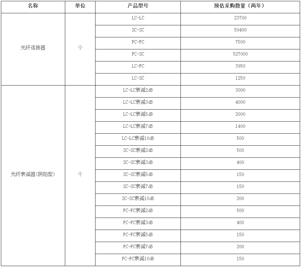 據(jù)了解,本次集采項目光纖連接器及光纖衰減器預計采購量為62.7萬只,光纖連接器采購型號分別有LC-LC、SC-SC、FC-FC、FC-SC、LC-FC、LC-SC等;光纖衰減器的型號有LC-LC衰減2db/3db/5db/7db/10db、SC-SC衰減db/3db/5db/7db/10db、FC-FC衰減2db/3db/5db/7db/10db。