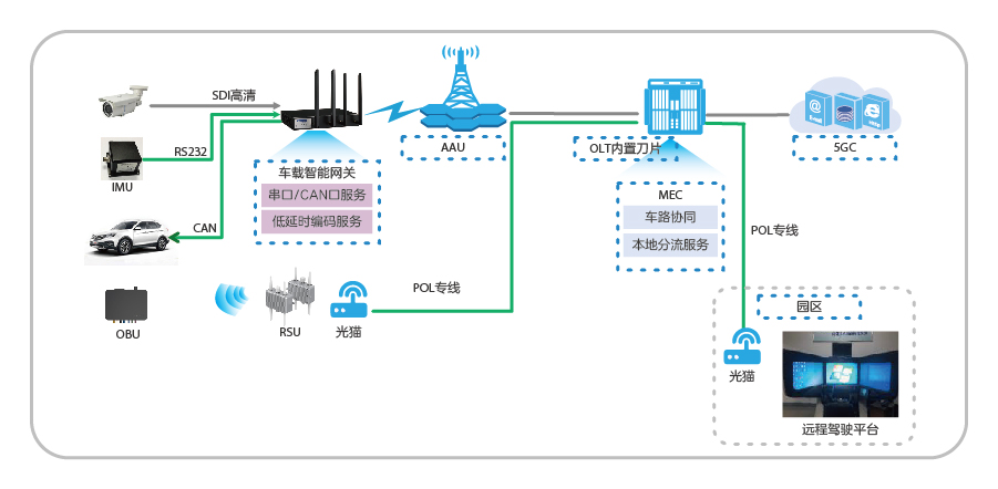 - 端到端時(shí)延滿足遠(yuǎn)程駕駛要求:方案將5G UPF和MEP下沉到OLT內(nèi)置刀片,業(yè)務(wù)流無(wú)需通過(guò)上層的5GC核心網(wǎng),極大縮短傳輸路徑,降低時(shí)延。