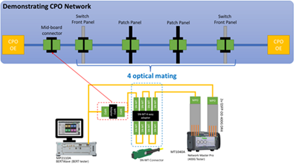 根據(jù)Co-Package Optics Collaboration在2021年發(fā)布的規(guī)范要求文檔,需要1個(gè)CPO 3.2Tb引擎才能與8個(gè)400G模塊(如DR4和FR4)進(jìn)行互操作。安立和SENKO采用400G DR4模塊演示為CPO應(yīng)用設(shè)置的測試系統(tǒng)。
