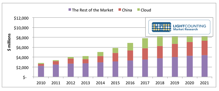 這些光器件公司財報遇到的負面影響是由第一季度中國對光學技術(shù)產(chǎn)品需求季度性走弱導致的,F(xiàn)inisar和NeoPhotonics是如此,依賴性更小的Acacia也受到影響。LightCounting將之描述成這些公司“生產(chǎn)中的小故障”,認為這些事件只是意外偶然的事情而非市場整體下滑的趨勢信號,依然維持對2017年大型數(shù)據(jù)中心100GbE以太網(wǎng)光器件市場快速增長的預測。