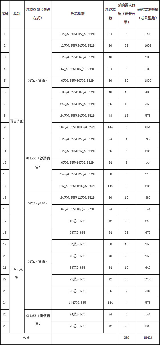 據(jù)此前招標(biāo)公告顯示,該項(xiàng)目采購(gòu)內(nèi)容為G.655光纜及混合光纜,合計(jì)26個(gè)類(lèi)型,共380皮長(zhǎng)公里。
