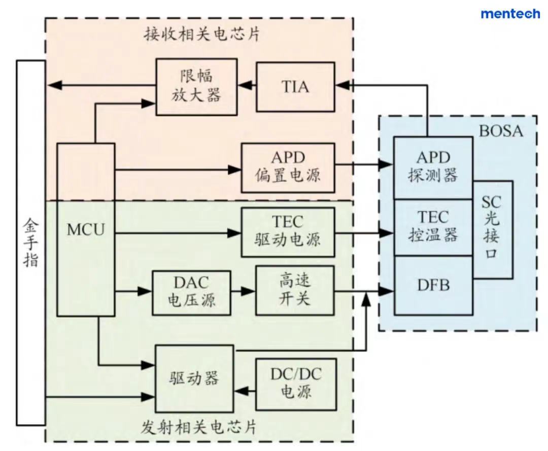 銘普25G ONU光模塊,支持高達25Gb/s的傳輸速率,采用不歸零編碼(NRZ)調制方式,支持雙向傳輸,并通過波分復用技術實現(xiàn)單纖雙向傳輸。整體結構包括發(fā)射端和接收端兩部分,其中發(fā)射端包含控制單元(MCU)、驅動器、DC/DC電源等電芯片,以及分布反饋激光器(DFB)等光器件;接收端則包含限幅放大器、跨阻放大器(TIA)、雪崩光電二極管(APD)等關鍵組件。