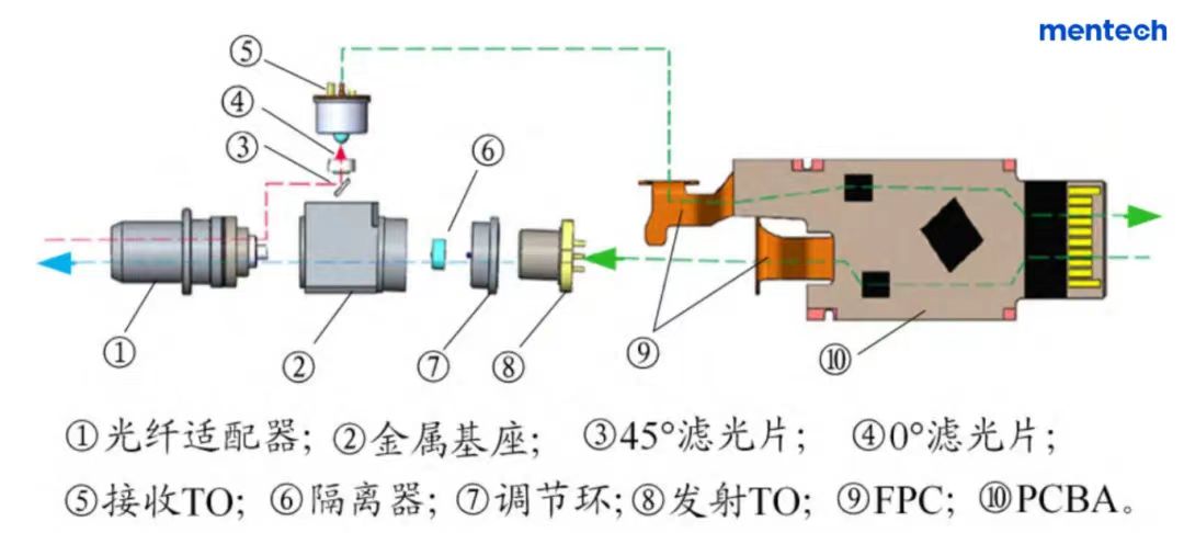 發(fā)射1286nm波長光信號傳輸過程:首先,當DFB激光器發(fā)射光信號后,經過非球透鏡進行光路匯聚以提高入纖功率耦合效率;其次,再經過⑥隔離器隔離反射光后,防止反向光影響到DFB的工作性能;最終,再水平穿過③45°濾光片后進入①斜8°角的光纖適配器。