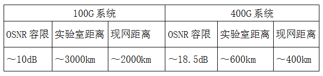 系統(tǒng)方面,100G系統(tǒng)采用PM-QPSK調制格式,400G系統(tǒng)采用雙載波的PM-16QAM調制格式。根據(jù)實驗結果結合理論分析,采用PM-QPSK調制格式的100G系統(tǒng)的背靠背OSNR容限約為10dB,能夠在G.652光纖上傳輸約3000km(5dB OSNR余量);采用PM-16QAM調制格式的400G系統(tǒng)的背靠背OSNR容限約為18.5dB,能夠在G.652光纖上傳輸約450km(5dB OSNR余量),測試性能結果如表1所示。對于超低損光纖和大有效面積光纖,400G的傳輸距離可以被延長到約600km和900km(5dB OSNR余量)。因此超低損光纖和大有效面積光纖對于延長400G系統(tǒng)的傳輸距離幫助非常大。