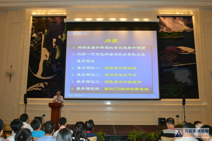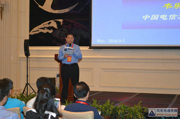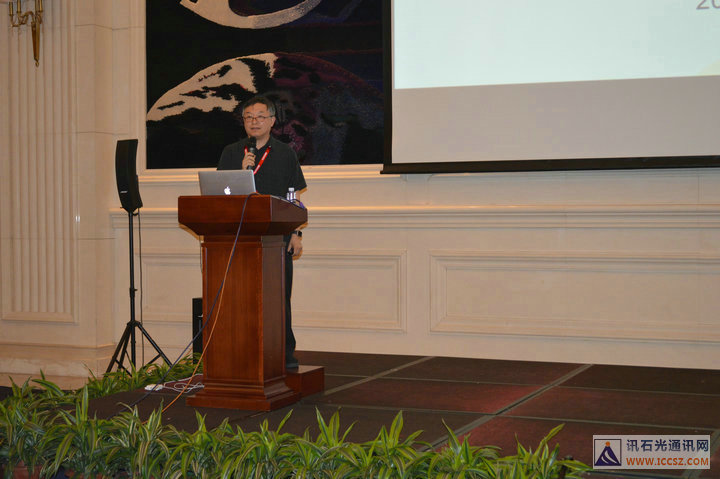 會(huì)議正式開(kāi)始,首先由工信部通信科技委常務(wù)副主任、 中國(guó)電信科技委主任、中國(guó)SDN/NFV產(chǎn)業(yè)聯(lián)盟理事長(zhǎng)韋樂(lè)平帶來(lái)主題演講《新一代傳送網(wǎng)的演進(jìn)趨勢(shì)和挑戰(zhàn)》。韋總的演講內(nèi)容中不乏他和電信研究院嘔心瀝血花費(fèi)數(shù)月研究計(jì)算得出的結(jié)果,都是實(shí)打?qū)嵉臄?shù)據(jù)。韋主任從網(wǎng)絡(luò)流量和帶寬的變化趨勢(shì)和預(yù)測(cè)講起,全球骨干流量增速回落到年均30%,但CTC骨干流量增速近10年仍高達(dá)45%。視頻流量占比總量的65%!用戶人均流量固網(wǎng)絕對(duì)主導(dǎo),占98%,移動(dòng)<1.5%。韋總表示,光通信是帶寬的瓶頸,而器件是瓶頸中的瓶頸,這是沒(méi)有預(yù)料到的。他還提及,中國(guó)電信今年在長(zhǎng)江中下游已經(jīng)在采用ROADM,并介紹了中國(guó)電信設(shè)想中的新一代傳送網(wǎng)架構(gòu)。后面又談到了向新一代傳送網(wǎng)演進(jìn)的必要性及其基本特征:超高速傳輸鏈路、透明傳送光節(jié)點(diǎn)、超低損光纖物理網(wǎng)、面向SDN的網(wǎng)絡(luò)新架構(gòu)。韋主任分析了我國(guó)光纖到戶瘋狂發(fā)展的重要原因是特殊的低成本優(yōu)勢(shì):人工,器件設(shè)備也相對(duì)便宜。韋總最后總結(jié)到:中國(guó)光通信維持高速發(fā)展到2020年是沒(méi)問(wèn)題的!
