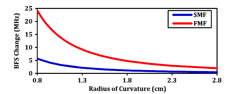 圖10 單模光纖和少模光纖彎曲布里淵頻移響應(yīng)結(jié)果