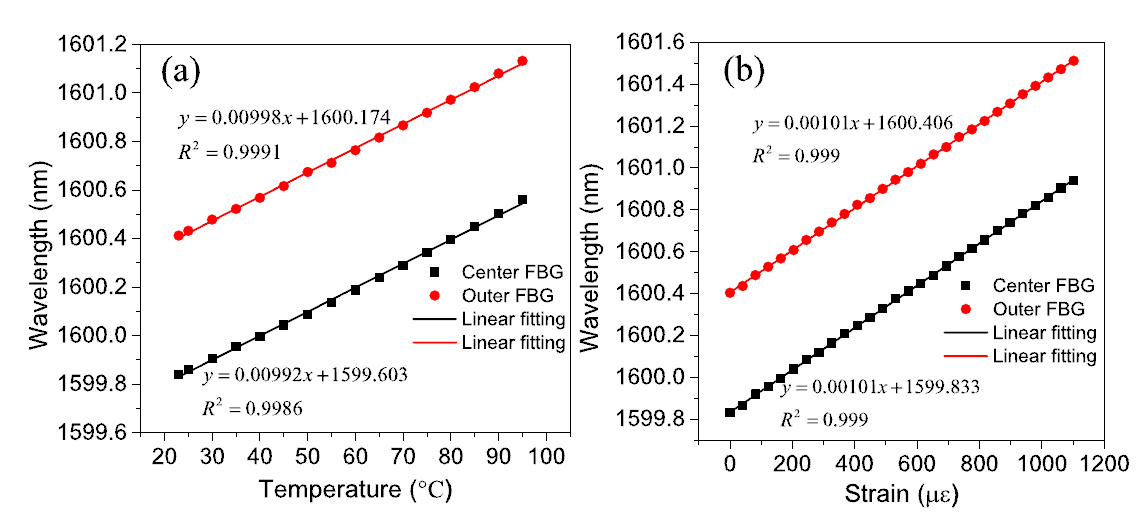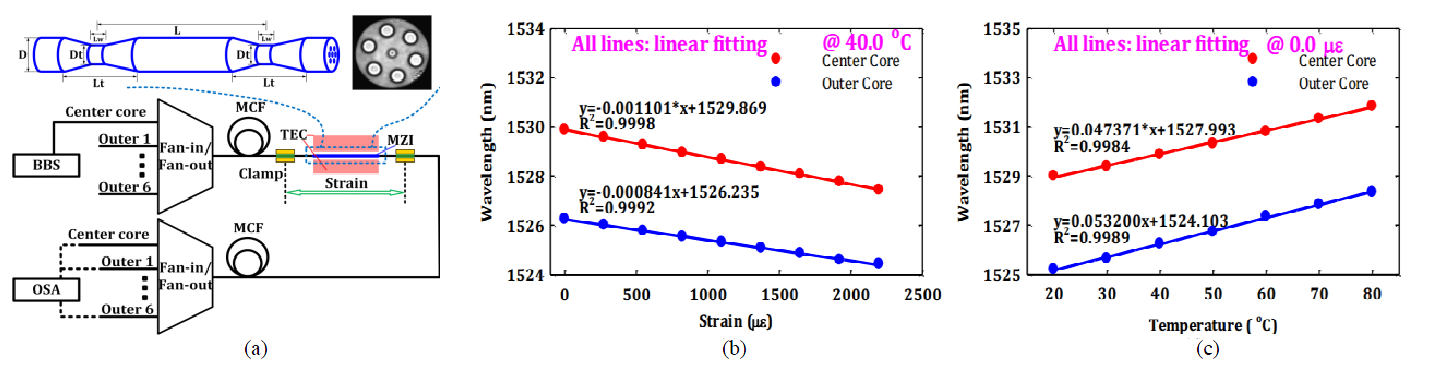 如圖7(a)所示,通過對異質(zhì)型多芯光纖進行電弧放電拉錐處理,在拉錐處增強了纖芯之間的耦合,兩個拉錐點以及中間的多芯光纖構(gòu)造成了一個線內(nèi)的馬赫澤德干涉儀結(jié)構(gòu)。由于異質(zhì)型多芯光纖各個纖芯材料不同,它們的折射率變化對外界環(huán)境的響應(yīng)也不同,因此各個芯的干涉系數(shù)也不相同。利用我們的低損耗復(fù)用/解復(fù)用器,最終實現(xiàn)了中間芯溫度系數(shù)47.37pm/°C、應(yīng)力系數(shù)1.10pm/με,外圍芯溫度靈系數(shù)53.20pm/°C、應(yīng)力系數(shù)0.84pm/με,如圖7(b)(c)所示。最終,實現(xiàn)了利用一根多芯光纖對溫度和應(yīng)力進行同時測量,測量誤差小于5%。