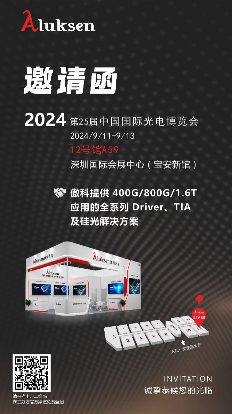 ICC訊 匯聚全球光電科技,盡在中國深圳光電博覽會(CIOE)。本屆CIOE將于2024年9月11-13日在深圳國際會展中心(寶安新館)隆重舉辦。在這個全球光電科技匯聚的盛會上,傲科光電將展示業(yè)界領(lǐng)先的400G/800G/1.6T 應(yīng)用的全系列Driver、TIA及硅光解決方案。