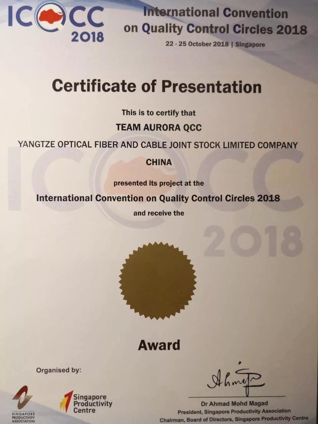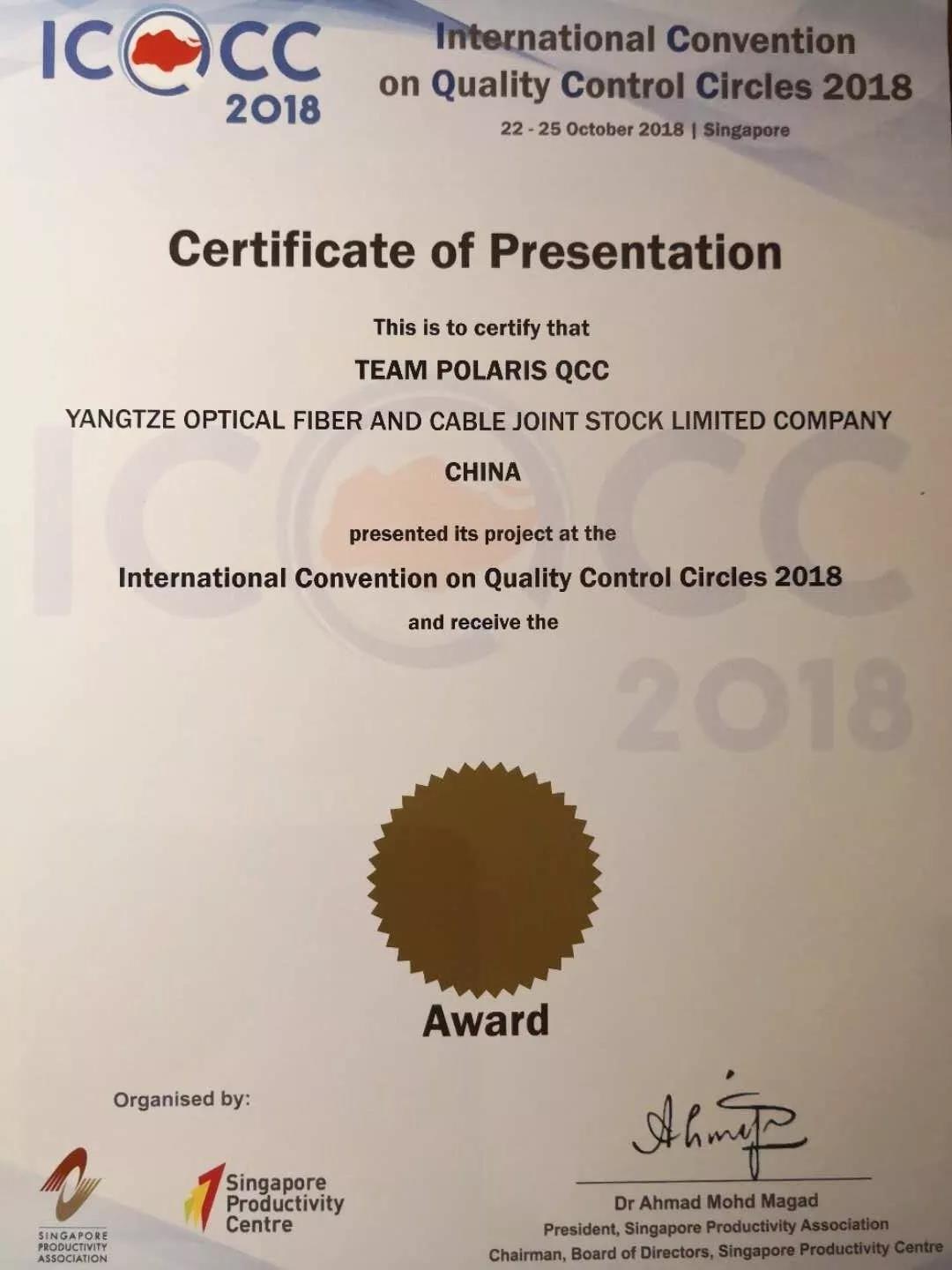 ICCSZ訊 2018年10月23~25日,第43屆國際質量管理小組大會(ICQCC)在新加坡圣淘沙名勝世界酒店隆重舉行。來自日本、韓國、中國、印度等15個國家和地區(qū)的2300名會議代表參加了這次盛會,大會共有447個QC小組參加國際發(fā)表賽。其中,中國代表團選送了69個課題小組參加此次競賽。長飛光纖光纜股份有限公司(以下簡稱“長飛公司”,股票代碼:601869.SH、06869.HK)北極光、北極星兩個QC小組參與大賽角逐,最終都喜獲金獎。