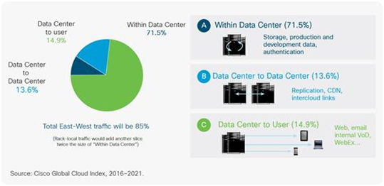 如下圖所示,數(shù)據(jù)中心內(nèi)部的數(shù)據(jù)交換量占了70%以上的比例,而不同的數(shù)據(jù)中心之間的DCI(Data Center Interconnection)數(shù)據(jù)通信僅為13%左右,這也就可以理解為什么數(shù)據(jù)中心業(yè)務(wù)大發(fā)展階段,與之對(duì)應(yīng)的光模塊發(fā)展如此的迅速。