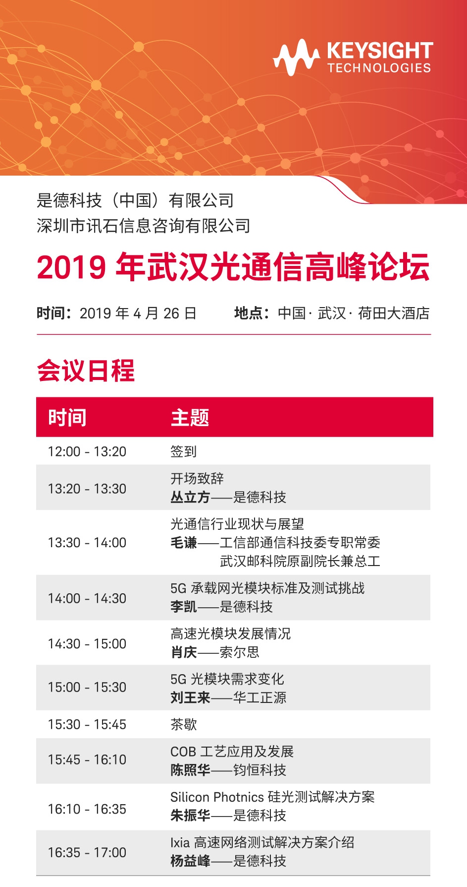 2019年4月26日,全球領先測試與分析解決方案提供商是德科技攜手訊石信息咨詢將隆重舉辦《2019武漢光通信高峰論壇》,圍繞“硅光”、“5G承載”、“光模塊”、“先進測試方案”進行深度討論,邀請行業(yè)知名專家與武漢當?shù)刂髽I(yè)代表出席討論,還有是德科技資深測試領域專家作精彩演講?,F(xiàn)誠邀廣大光通信同仁齊聚武漢,聽大咖講述行業(yè)現(xiàn)狀,分析展望全球通信發(fā)展新趨勢,與“中國光谷”知名光模塊企業(yè)一起探討5G承載及先進硅光技術進展與未來,歡迎各位光通信同仁報名參加!