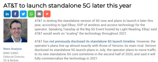 AT&T此前并未透露其5G SA的發(fā)布時間。從目前來看,這家運(yùn)營商的計劃幾乎與其主要競爭對手Verizon的計劃完全一致。今年7月,Verizon公布了5G SA計劃,計劃在2020年下半年將流量轉(zhuǎn)移到新的5G SA核心上,并表示將在2021年將該技術(shù)完全商業(yè)化。
