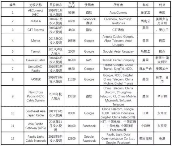 1、云計(jì)算廠商是海底光纖的主要使用者。根據(jù)統(tǒng)計(jì),在12條遍布各大洲的海底電纜中,Google、微軟、Facebook、AWS是主要的使用者,這說明它們對于洲際的海量數(shù)據(jù)傳輸有著極大的需求。其中,Google使用的數(shù)量最多,微軟次之,再次是Facebook,最后是亞馬遜AWS。