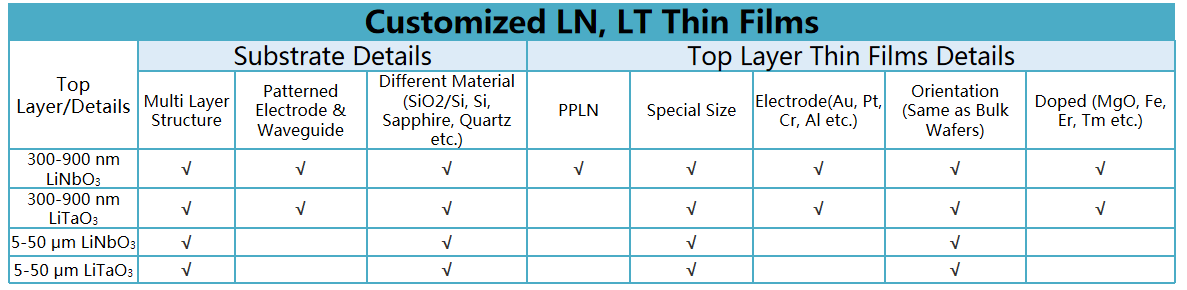 晶正主營產(chǎn)品為3、4、6英寸300 nm-900 nm鈮酸鋰單晶薄膜;4、6英寸300 nm-900 nm鉭酸鋰單晶薄膜;5-50 um硅上鈮酸鋰單晶薄膜;5-50um硅上鉭酸鋰單晶薄膜;20-60μm超薄鈮酸鋰、鉭酸鋰晶片等,并提供離子注入代工服務(wù)。晶正生產(chǎn)的鈮酸鋰、鉭酸鋰單晶薄膜產(chǎn)品,晶格結(jié)構(gòu)為單晶,保持了體材料的物理性質(zhì)具有優(yōu)異的表面粗糙度以及厚度均勻性。