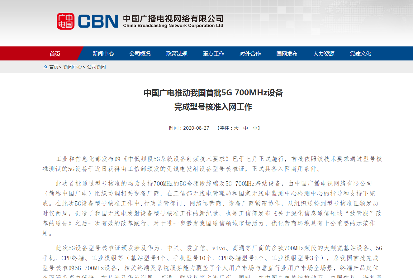 《中國廣電推動我國首批5G 700MHz設(shè)備完成型號核準(zhǔn)入網(wǎng)工作》