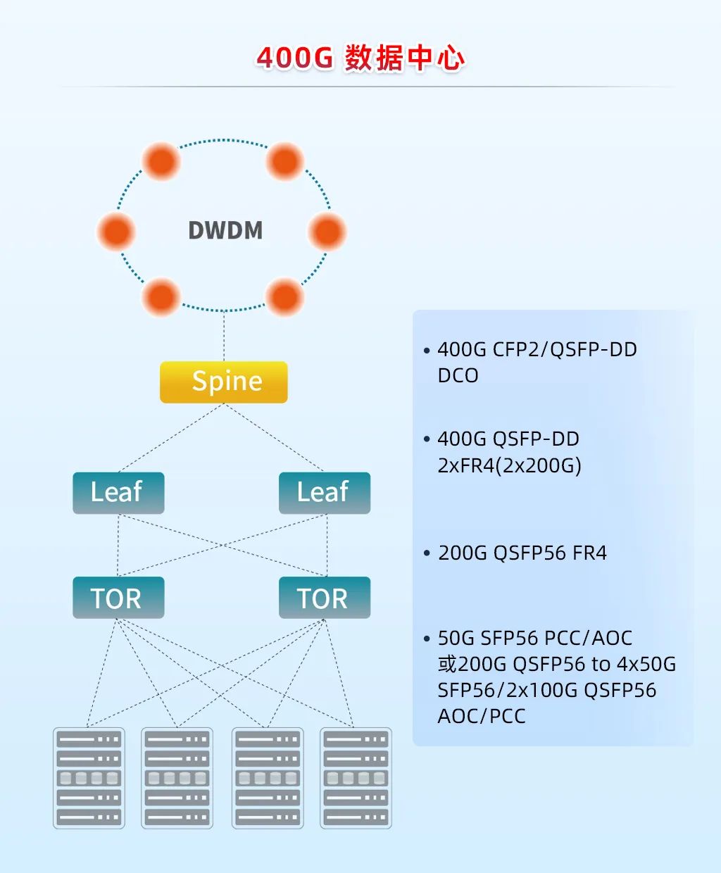 新推出的400G QSFP-DD 2×FR4與以往的400G QSFP-DD FR4的主要不同點(diǎn)在于:400G 2×FR4光口支持8×50G PAM4,而400G FR4光口為4×100G PAM4;400G QSFP-DD 2×FR4還具備組網(wǎng)優(yōu)勢(shì),它采用2×Dual LC光接口,支持扇出兩個(gè)200G QSFP56光模塊,可完成200G數(shù)據(jù)中心朝向400G數(shù)據(jù)中心的直接躍遷。其組網(wǎng)架構(gòu)如下: