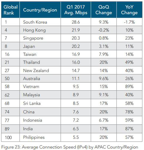 Iccsz訊 日前,全球最大的云服務發(fā)布平臺之一Akamai發(fā)布了2017年第一季度互聯(lián)網(wǎng)狀況報告,包括有線寬帶和移動互聯(lián)網(wǎng)。數(shù)據(jù)顯示今年第一季度全球平均網(wǎng)速同比增長15%至7.2 Mbps,平均峰值網(wǎng)速增長28%至44.6 Mbps。從國家和地區(qū)來看,今年第一季度韓國平均網(wǎng)速最高,達28.6 Mbps,但同比有1.7%的降幅。中國大陸地區(qū)平均網(wǎng)速增長78%至7.6Mbps,超過全球平均水平,排在第74位。