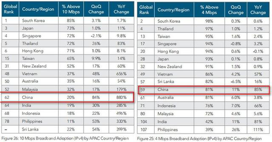 普及率方面,中國大陸4Mbps及其以上寬帶普及率為81%,同比增長85%,排在全球第59位。10Mbps及以上的普及率為20%,同比增長880%,可以說提速降費初見成效。