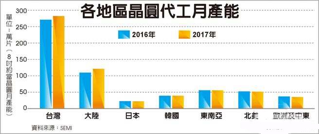 在兩岸持續(xù)投資下,預(yù)料晶圓代工產(chǎn)能每年將成長(zhǎng)5%,超越業(yè)界整體表現(xiàn),晶圓代工產(chǎn)能到2017年底預(yù)計(jì)將達(dá)到每月6百萬片8寸約當(dāng)晶圓,而臺(tái)灣更穩(wěn)坐全球擁有最大晶圓代工產(chǎn)能的地區(qū)。