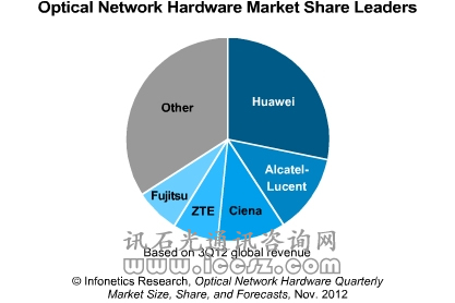 【訊石光通訊咨詢網(wǎng)】市場研究公司Infonetics Research上周發(fā)布的3Q12光網(wǎng)絡硬件商市場份額報告顯示,3Q12全球光網(wǎng)絡硬件市場(包括WDM和SONET/SDH)環(huán)比下滑2%,這是該市場在經(jīng)歷了連續(xù)5個季度的輕微增長后連續(xù)3個季度下滑。