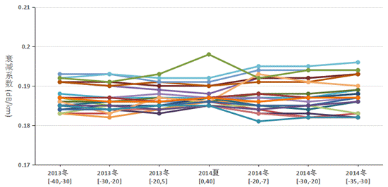 根據(jù)截至最近光纖光纜運(yùn)行監(jiān)測(cè)情況,跟蹤不同光纜中光纖衰減系數(shù)隨溫度的變化,可得到如下初步結(jié)論:通過(guò)對(duì)衰減和溫度數(shù)據(jù)的監(jiān)測(cè),可以觀察到衰減隨溫度的變化,光纜類(lèi)型GYA和GYTA中1.7mm、1.9mm及2.1mm套管尺寸中光纖衰減變化隨溫度變化區(qū)別不明顯,圖4給出了GYTA光纜部分時(shí)間段的監(jiān)測(cè)數(shù)據(jù)。2013-2017年第一觀測(cè)和研究期的詳細(xì)結(jié)果即將整理分析完成,并將進(jìn)行研討和推廣。