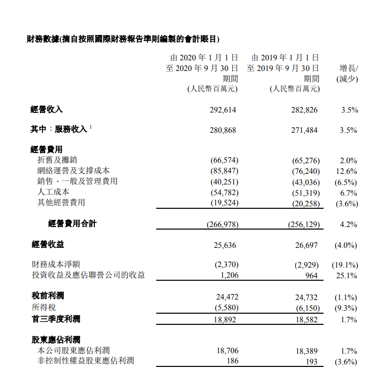 2020年首三季度,中國電信經(jīng)營業(yè)績保持堅實。網(wǎng)絡(luò)運(yùn)營及支撐成本較去年同期上升 12.6%,主要原因是公司持續(xù)優(yōu)化提升網(wǎng)絡(luò)能力和質(zhì)量,支撐 5G、產(chǎn)業(yè)數(shù)字化業(yè)務(wù)發(fā)展;銷售、一般及管理費(fèi)用較去年同期下降 6.5%,主要原因是公司持續(xù)優(yōu)化營銷模式,加強(qiáng)營銷資源的精準(zhǔn)投入;人工成本較去年同期上升 6.7%,主要原因是公司適度加大向一線員工和專業(yè)技術(shù)人才的激勵;其他經(jīng)營費(fèi)用比去年同期下降 3.6%,主要原因是移動終端銷售數(shù)量下降。期內(nèi)財務(wù)成本凈額較去年同期下降 19.1%,主要原因是公司持續(xù)提升集團(tuán)內(nèi)部資金集約能力,并抓住較好市場利率機(jī)會,將銀行貸款置換為較低成本的債券產(chǎn)品。投資收益及應(yīng)占聯(lián)營公司的收益較去年同期上升 25.1%,主要由于期內(nèi)應(yīng)占中國鐵塔股份有限公司損益增加所致。