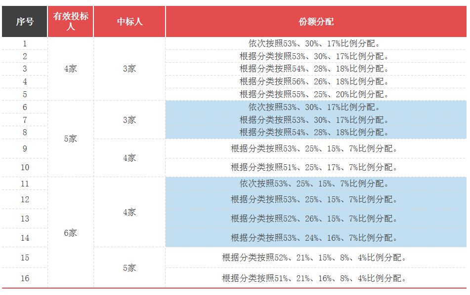 根據(jù)供應(yīng)商綜合實(shí)力,進(jìn)行供應(yīng)商分類;在此基礎(chǔ)上,按照有效投標(biāo)人數(shù)量、分類綜合得分排序,確定中標(biāo)人及動(dòng)態(tài)份額分配。