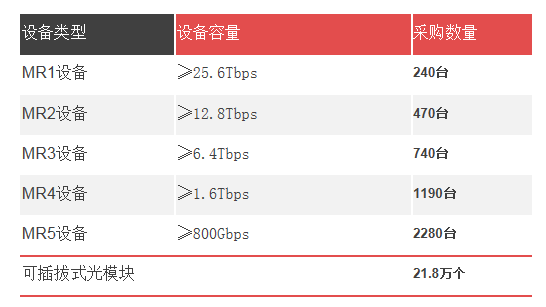 根據(jù)中國(guó)聯(lián)通3月4日的招標(biāo)公告顯示,本次項(xiàng)目為集中招標(biāo)內(nèi)容為:(1)采購核心匯聚設(shè)備整機(jī)部分4920臺(tái),其中:MR1設(shè)備 240臺(tái)(設(shè)備容量≥25.6Tbps),MR2設(shè)備 470臺(tái)(設(shè)備容量≥12.8Tbps),MR3 設(shè)備740臺(tái)(設(shè)備容量≥6.4Tbps),MR4 設(shè)備1190臺(tái)(設(shè)備容量≥1.6Tbps),MR5設(shè)備2280臺(tái)(設(shè)備容量≥800Gbps);(2)采購可插拔式光模塊21.8萬個(gè)。