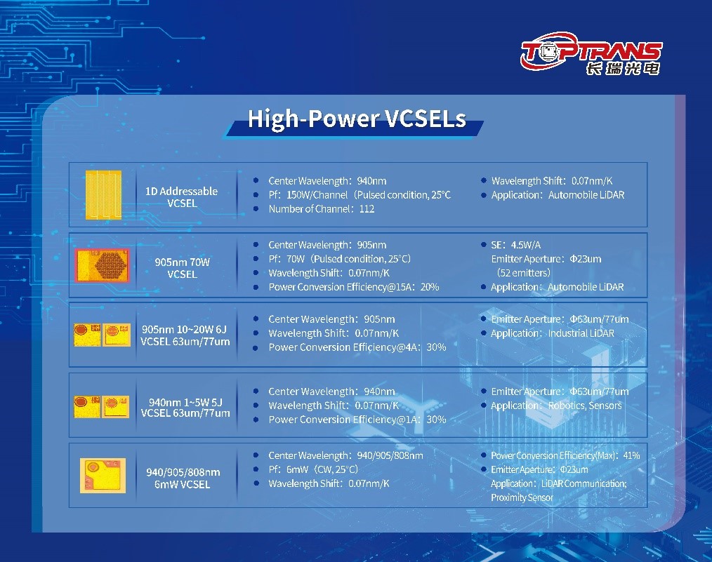 在消費(fèi)電子和汽車兩大終端產(chǎn)品的智能化需求之下,VCSEL芯片在工業(yè)傳感等領(lǐng)域迎來(lái)更加龐大的市場(chǎng)需求。得益于長(zhǎng)期產(chǎn)品開發(fā)的經(jīng)驗(yàn),長(zhǎng)瑞已經(jīng)開拓了更加豐富的VCSEL芯片產(chǎn)品線。目前,長(zhǎng)瑞光電VCSEL芯片產(chǎn)品現(xiàn)已涵蓋8xx-9xx多個(gè)波長(zhǎng)、單結(jié)和多結(jié)、6mW-70W等不同功率VCSEL芯片。產(chǎn)品形態(tài)包括:?jiǎn)吸c(diǎn)、陣列、可尋址等;支持VCSEL SMD、TO等封裝系列,滿足工業(yè)傳感市場(chǎng)多樣化的產(chǎn)品需求。