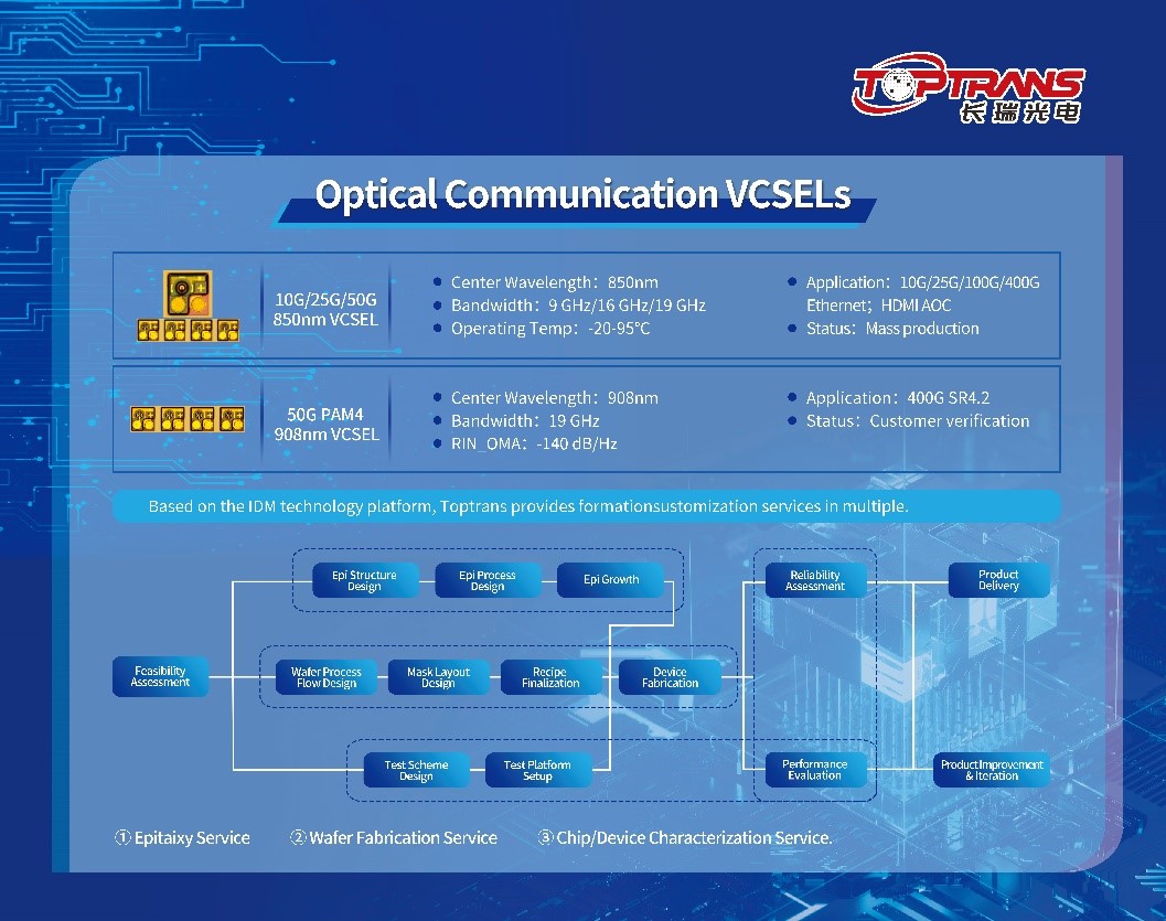 長(zhǎng)瑞致力于為光通信客戶開發(fā)低成本、低功耗、高性能、長(zhǎng)壽命的VCSEL激光器芯片,目前已實(shí)現(xiàn)850nm多模10G,25G系列VCSEL芯片的量產(chǎn)出貨,同時(shí)率先推出面向200G/400G 短距傳輸光模塊應(yīng)用的50G 850nm PAM4 VCSEL光芯片產(chǎn)品,現(xiàn)已通過(guò)多家客戶驗(yàn)證,并獲得批量訂單。公司緊跟市場(chǎng)需求,也快速研發(fā) 50G 908nm PAM4 VCSEL,助力數(shù)據(jù)中心下一代高速光互連的發(fā)展。