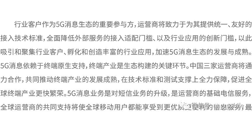 本次《5G消息白皮書》的發(fā)布,展現(xiàn)出三大運(yùn)營(yíng)商大力發(fā)展5G消息業(yè)務(wù)的能力與決心。下一步,中國(guó)移動(dòng)、中國(guó)電信、中國(guó)聯(lián)通將與全球運(yùn)營(yíng)商、產(chǎn)業(yè)合作伙伴通力合作,將5G消息業(yè)務(wù)打造成為多終端支持、廣用戶覆蓋、多行業(yè)賦能的5G普適性信息通信服務(wù),以促進(jìn)消息類業(yè)務(wù)價(jià)值提升,驅(qū)動(dòng)全球5G產(chǎn)業(yè)生態(tài)繁榮發(fā)展。