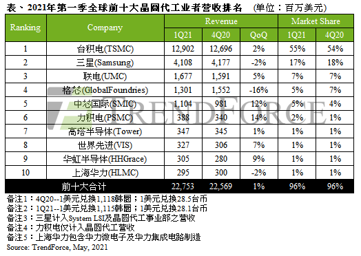 ICC訊 據(jù)市場調(diào)研機(jī)構(gòu)集邦科技統(tǒng)計(jì),2021年第一季度,全球TOP10晶圓代工廠產(chǎn)值達(dá)227.5億美元,環(huán)比增長1%,再創(chuàng)歷史新高。