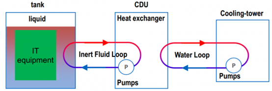 以下以一個二相浸沒式冷卻的模型為例,采用的是3M公司的氟化液,沸點溫度。冷卻液機柜Tank內(nèi)置冷卻液盤管,與電子元器件吸熱沸騰汽化后,氣態(tài)氟化液在冷卻液盤管壁面冷凝成液體,實現(xiàn)熱量從電子元器到冷卻液的轉移,冷卻液在冷去液分配單元CDU內(nèi)與外循環(huán)的冷卻水通過板式換熱器換熱后,熱量最終通過室外的冷卻塔散到環(huán)境中去。
