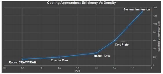 第四,浸沒式液冷技術有助于提高數(shù)據(jù)中心單位空間的服務器密度,大幅提升數(shù)據(jù)中心的運算效率。液冷數(shù)據(jù)中心省卻了空調(diào)系統(tǒng)和相應基礎設施的建設,節(jié)省了大量空間,可以容納更多的服務器。同時,液冷技術可以應對高功率密度數(shù)據(jù)中心的冷卻工作,如單機柜配電量達到50KW以上甚至未來達到150KW,液冷數(shù)據(jù)中心可以配置高密度的服務器從而使單位空間達到相較傳統(tǒng)機房高幾倍甚至幾十倍的運算效率。如下圖參考多冷卻方式的效率與機柜功率密度。
