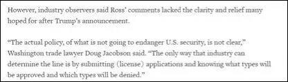 但從英國(guó)路透社的報(bào)道來看,不少美國(guó)企業(yè)和業(yè)內(nèi)觀察人士仍對(duì)美國(guó)商務(wù)部的這一最新表態(tài)持觀望態(tài)度,因?yàn)?A href="http://partyval.com/site/CN/Search.aspx?page=1&keywords=%e7%be%8e%e5%9b%bd&column_id=ALL&station=%E5%85%A8%E9%83%A8" target="_blank">美國(guó)商務(wù)部并沒有明確地表示什么樣的交易才不會(huì)對(duì)美國(guó)的國(guó)家安全構(gòu)成威脅。