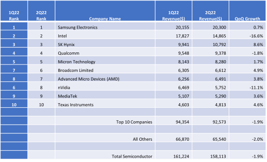對(duì)頂級(jí)半導(dǎo)體公司業(yè)績(jī)的回顧顯示,英特爾和英偉達(dá)在2Q22的總降幅為37億美元;這是由于消費(fèi)者對(duì)其產(chǎn)品需求疲軟,以及在這種不確定的時(shí)期,原始設(shè)備制造商(OEM)持有的庫(kù)存減少。另一家收入排名前十的公司在2Q22出現(xiàn)下滑的是高通。其余公司2Q22營(yíng)收均有所增長(zhǎng)。