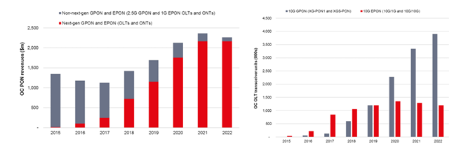 中國電信運營商對10G PON的持續(xù)部署推動該市場快速發(fā)展,中國電信2018年10G PON采購總規(guī)模達到315萬端。10G PON可支持住宅和非住宅應(yīng)用和用戶,包括企業(yè)和商業(yè)服務(wù)、以及移動回傳(MBH)和潛在的移動前傳,滿足未來家庭、企業(yè)對流量更高的需求。根據(jù)Ovum分析,10G PON部署將推動FTTx PON光模塊的市場收入將會呈現(xiàn)大幅增長。2020年,PON光模塊市場預(yù)計將超過23億美元,屆時即10G PON光模塊收入將占據(jù)總市場收入的90%以上,預(yù)計在2022年達到96%。