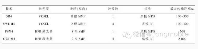 到100 Gbit/s后,單通道速率達(dá)到25 Gbit/s,由于模式色散的影響,多模技術(shù)的傳輸距離受到限制,單模技術(shù)開始在數(shù)據(jù)中心應(yīng)用得到重視。