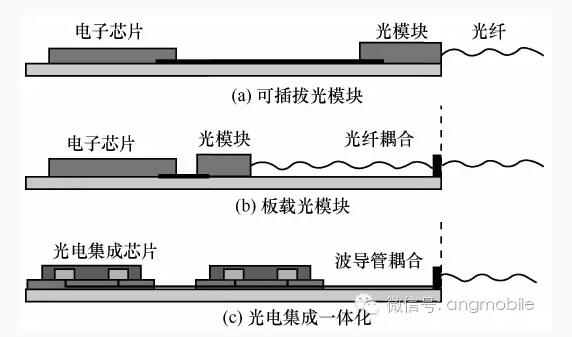 目前光模塊采用熱插拔的方式,通過交換機(jī)的面板接口和電子走線和交換芯片連接在一起,如圖10(a)所示。隨著交換機(jī)速率的提高,這段電子走線將會(huì)對信號(hào)產(chǎn)生愈來愈大的損傷,同時(shí)可插拔接口也限制了面板的密度。為解決這個(gè)問題,可以把光模塊移到交換機(jī)中去,使光模塊靠近交換芯片,光模塊通過光纖接到面板上,這種方式稱為板載光模塊,如圖10(b)所示。板載光模塊不僅可以減少電子走線對信號(hào)的損傷,簡化模塊設(shè)計(jì),還可以大大增加面部密度。最終電子芯片和光子芯片將集成在一起,大大簡化系統(tǒng)、降低功耗和成本,如圖10(c)所示。板載光模塊和光電集成模塊對器件的可靠性要求很高,因?yàn)榘遢d模塊和光電集成器件的故障都需要更換整個(gè)交換機(jī)電路板,不像更換可插拔光模塊那樣簡單易操作。