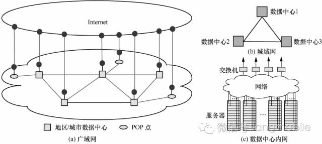 圖2給出了典型的大型互聯(lián)網(wǎng)公司數(shù)據(jù)中心網(wǎng)絡(luò)架構(gòu),包括廣域網(wǎng)、城域網(wǎng)和數(shù)據(jù)中心內(nèi)網(wǎng)。分布在不同地區(qū)的數(shù)據(jù)中心通過廣域網(wǎng)相互連接,根據(jù)架構(gòu)的不同,每個(gè)或部分數(shù)據(jù)中心通過外部通道和公共互聯(lián)網(wǎng)相連,用戶通過公共互聯(lián)網(wǎng)和外部通道進(jìn)入數(shù)據(jù)中心。為改善用戶體驗(yàn)、降低訪問時(shí)延,一般會(huì)在靠近用戶或用戶集中的地方設(shè)立POP點(diǎn),POP點(diǎn)通過專線直接連接到數(shù)據(jù)中心。這樣可以減少用戶訪問數(shù)據(jù)在公共互聯(lián)網(wǎng)中的滯留時(shí)間。