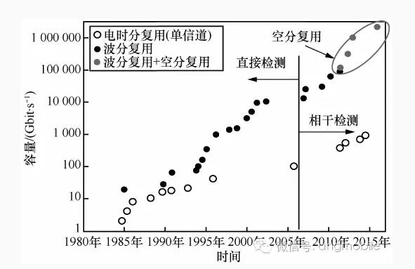 這些容量和距離的進(jìn)展得益于光纖技術(shù)、光放大技術(shù)、非線性管理技術(shù)、調(diào)制解調(diào)技術(shù)、光信號(hào)檢測技術(shù)等的發(fā)展。今天單模光纖的容量已經(jīng)接近了香農(nóng)極限。