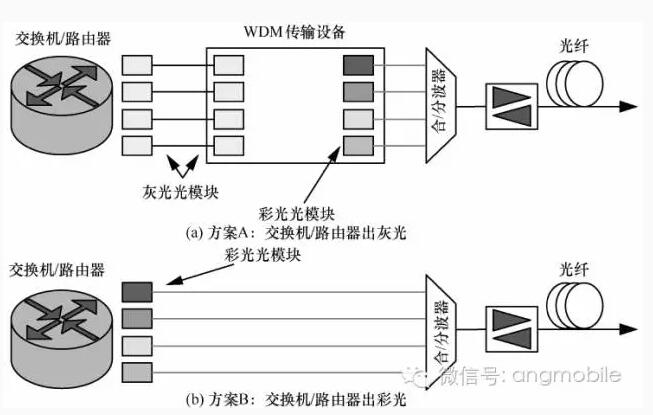 這些不同波長的彩光直接連接到合波器再經(jīng)過放大后傳送到另一個(gè)數(shù)據(jù)中心。方案A的好處是交換機(jī)、路由器及波分傳輸設(shè)備是分開的,用戶可以自由選擇各自最合適的方案。方案B的優(yōu)點(diǎn)是省了一對灰光光模塊,但是如果采用相十檢測彩光光模塊,交換機(jī)和路由器端口的密度會(huì)降低,如采用直接檢測彩光光模塊,對線路系統(tǒng)要求提高且傳輸容量受到限制,另外方案B把光傳輸和交換機(jī)/路由器結(jié)合在一起,有可能會(huì)限制技術(shù)的選擇自由度?;夜?A href="http://partyval.com/site/CN/Search.aspx?page=1&keywords=%e5%85%89%e6%a8%a1%e5%9d%97&column_id=ALL&station=%E5%85%A8%E9%83%A8" target="_blank">光模塊成本比彩光光模塊低很多,所以從成本上比較,這兩種方案難分仲伯,各自有自己的應(yīng)用場景。