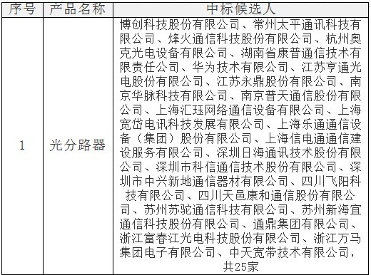 光纜分光分纖盒中標企業(yè)包括烽火通信、亨通光電、華為等25家。