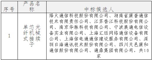 單芯光纖機械式接續(xù)子中標企業(yè)包括烽火通信、康普通信等10家。