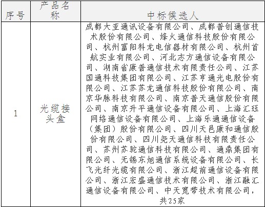 光纜接頭盒中標企業(yè)包括大亞通訊、烽火通信、亨通光電等25家。