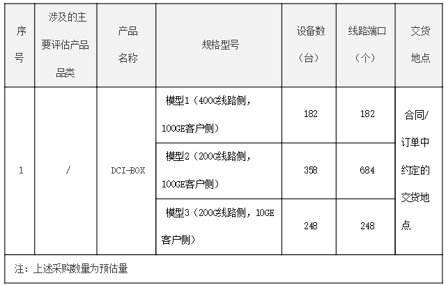 公告顯示,本次集采共分為三個(gè)規(guī)格型號(hào)。模型1(400G線(xiàn)路側(cè),100GE客戶(hù)側(cè))182臺(tái),線(xiàn)路端口182個(gè);模型2(200G線(xiàn)路側(cè),100GE客戶(hù)側(cè))358臺(tái),線(xiàn)路端口684個(gè);模型3(200G線(xiàn)路側(cè),10GE客戶(hù)側(cè))248臺(tái),線(xiàn)路端口248個(gè)。