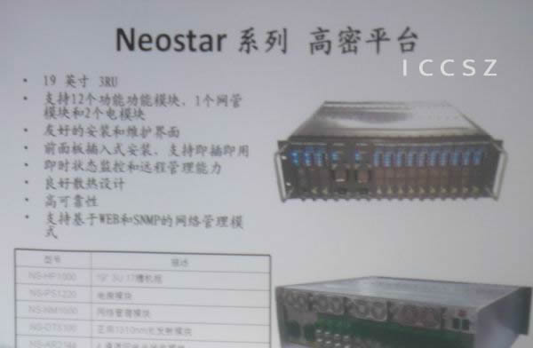 新飛通論壇進行了約兩個小時,David Piehler演講結(jié)束后,公司還向與會客戶展示了NeoStar高密平臺系列產(chǎn)品,包括NS-HP1000高密平臺機架、NS-NM1000網(wǎng)管模塊、NS-DT3100正向光發(fā)射模塊、NS-AR2144四路回傳光接收模塊、NS-FR2121正向光接收模塊、NS-PS1220電源模塊等六款產(chǎn)品。