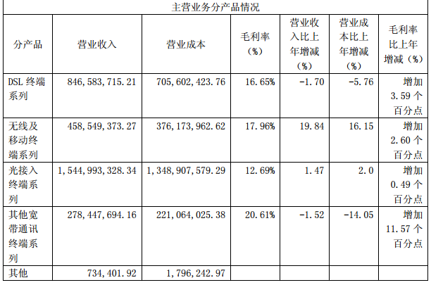 分產(chǎn)品收入情況看,光接入終端系列營收15.45億元,同比增長1.47%,毛利率12.69%,;因需求下降,導(dǎo)致DSL終端系列營收8.47億元,同比下降1.70%,但毛利率為16.65%,相比同期提升了3.59%。其他系列如無線及移動終端系列營收4.59億元。