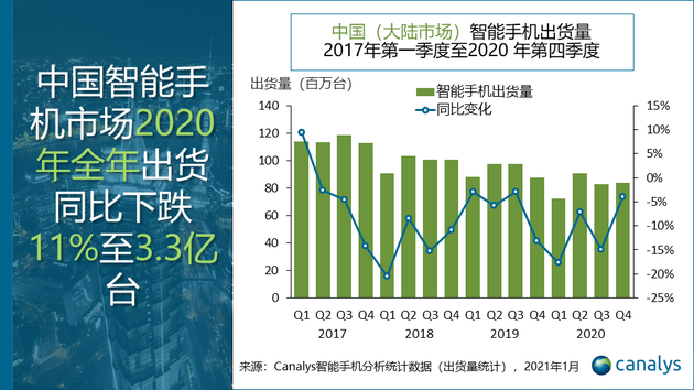 中國大陸智能手機(jī)市場2020年第四季度出貨量達(dá)到8400萬部,同比下降4%。2020年全年出貨同比下跌11%至3.3億臺,由于美國制裁導(dǎo)致華為業(yè)績迅速惡化,整體市場復(fù)蘇步伐遇阻。